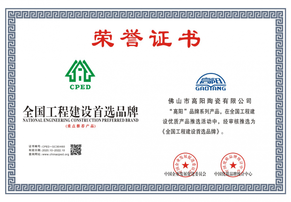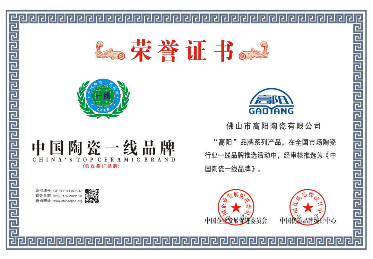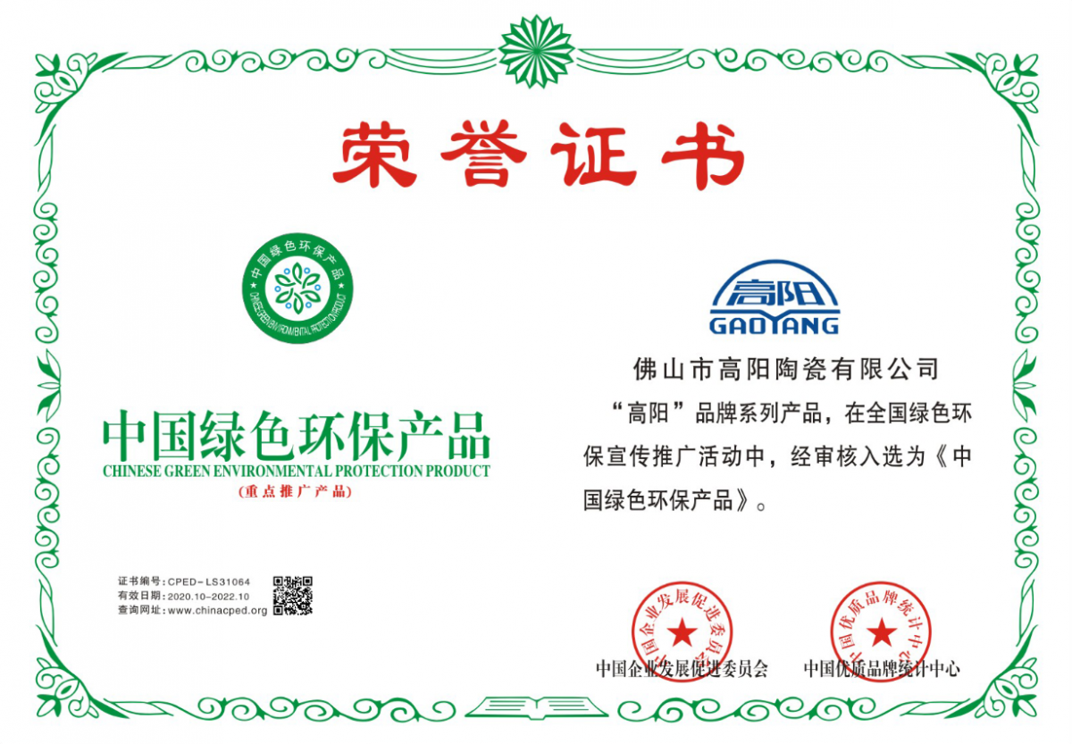 智能制造·國標認證,高陽陶瓷憑借強大的制造實力與精益求精的匠人精神,全系產品嚴格通過國家3C認證、ISO9001:2000國際質量體系認證,并先后榮獲“中國著名品牌”“中國陶瓷一線品牌”“中國環保綠色產品”“陶瓷品牌100強”“全國工程建設首選品牌”等榮譽。